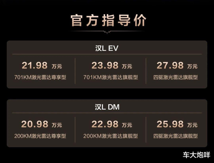 4月9日,比亚迪汉L正式上市,其中汉L DM提供3款车型,官方指导价20.98万-25.98万元;汉L EV可选3款车型,官方指导价21.98万-27.98万元。比亚迪汉L可以视为比亚迪王朝网轿车系列的旗舰产品,全系搭载天神之眼B-高阶智驾激光版(DiPilot 300),其中基于超级e平台打造的汉L EV最高可支持1000千瓦的充电功率。